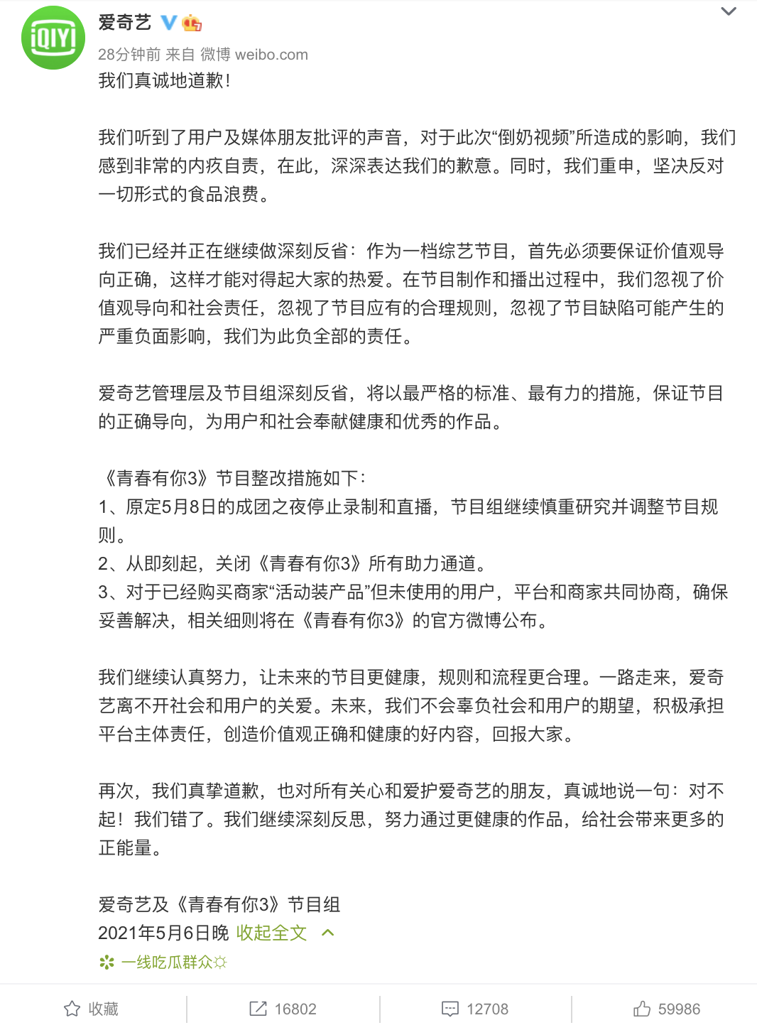 5月6日晚,爱奇艺官方微博发表致歉文章,并宣布《青春有你3》的整改措施,包括原定5月8日的成团之夜停止录制和直播,节目组继续慎重研究并调整节目规则。此外,从即刻起,关闭《青春有你3》所有助力通道。