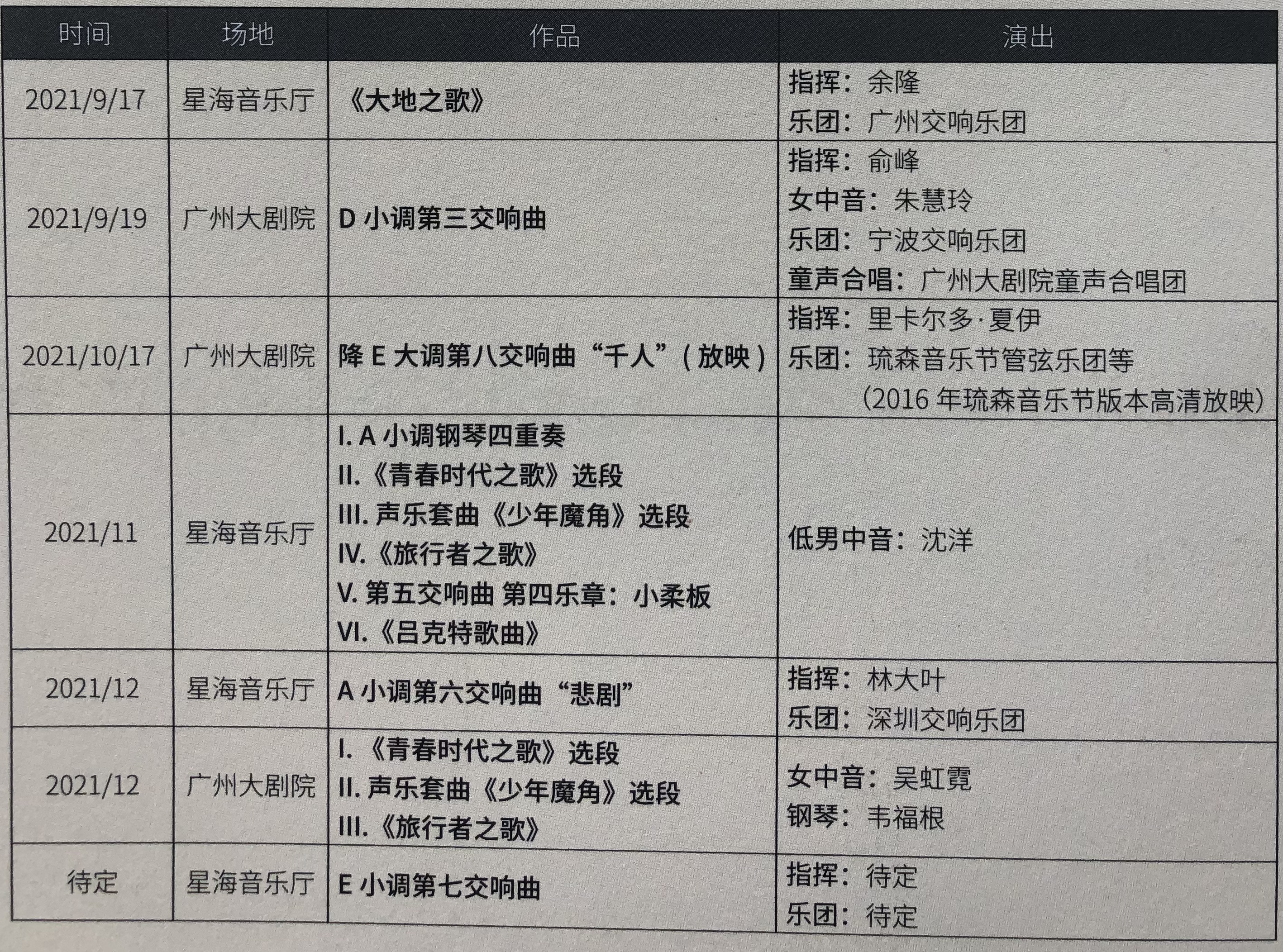 “2021广州马勒作品展演”全部在星海音乐厅和广州大剧院举办,以广州交响乐团、深圳交响乐团为主力阵容,演出马勒的大部分重要作品。其中广州交响乐团的五场音乐会包括广交音乐总监余隆指挥演出的《第四交响曲》和《大地之歌》、洪毅全指挥演绎的《第九交响曲》、黄屹指挥演绎的第一和第五交响曲;深圳交响乐团则在其音乐总监林大叶指挥下演绎马勒的第二、第五、第六交响曲;宁波交响乐团在中央音乐学院院长俞峰指挥下演奏第三交响曲;此外,女高音歌唱家宋元明将与张国勇指挥的贵阳交响乐团合作演出马勒的声乐套曲《少年魔角》选段;低男中音歌唱家沈洋、女中音歌唱家吴虹霓将分别举办马勒艺术歌曲音乐会。马勒第八交响曲将有国际著名的演出版本,在广州大剧院以高清放映的方式呈现,而“马七”也在密锣紧鼓筹划中。
