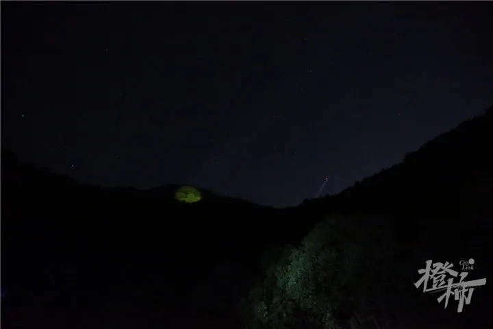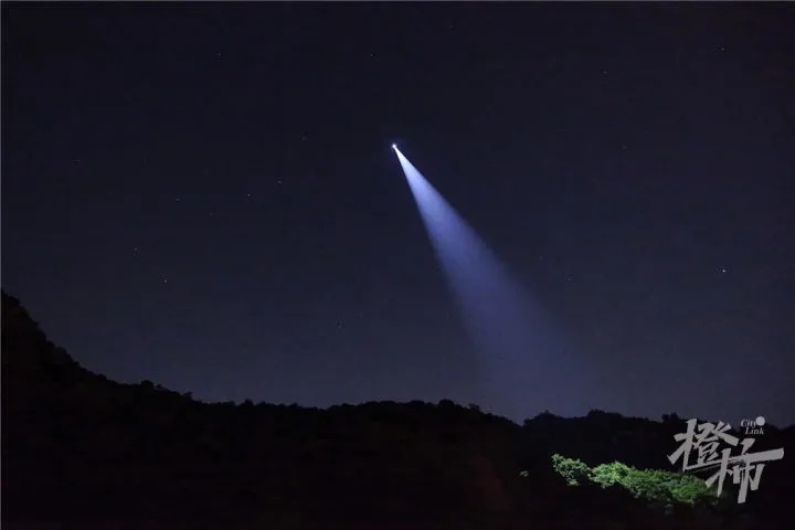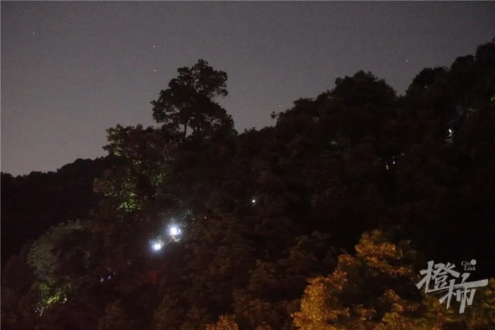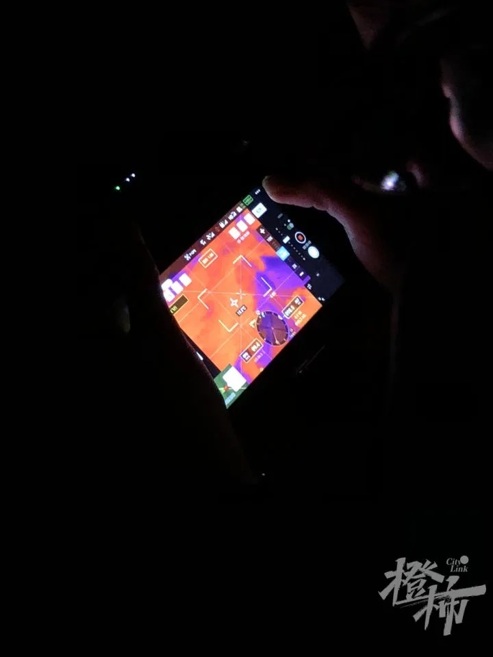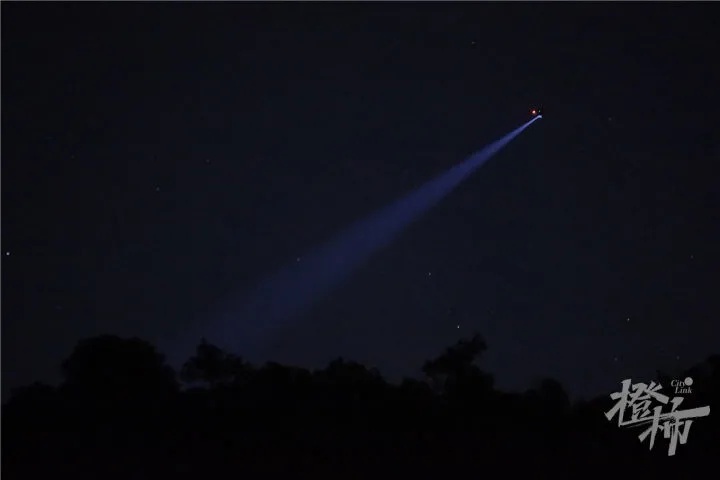 晚上10点多,多架热成像无人机在白龙潭景区附近山林上空搜寻第三只金钱豹,并利用自带探照灯打亮搜寻区域。