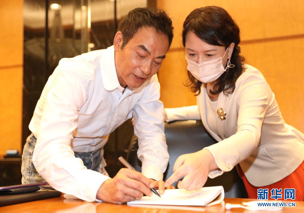 任達華(左)在接受新華社記者專訪時寫下《歲月神偷》的經典台詞——「但總是往前走」(4月22日攝)。新華社記者 吳曉初 攝