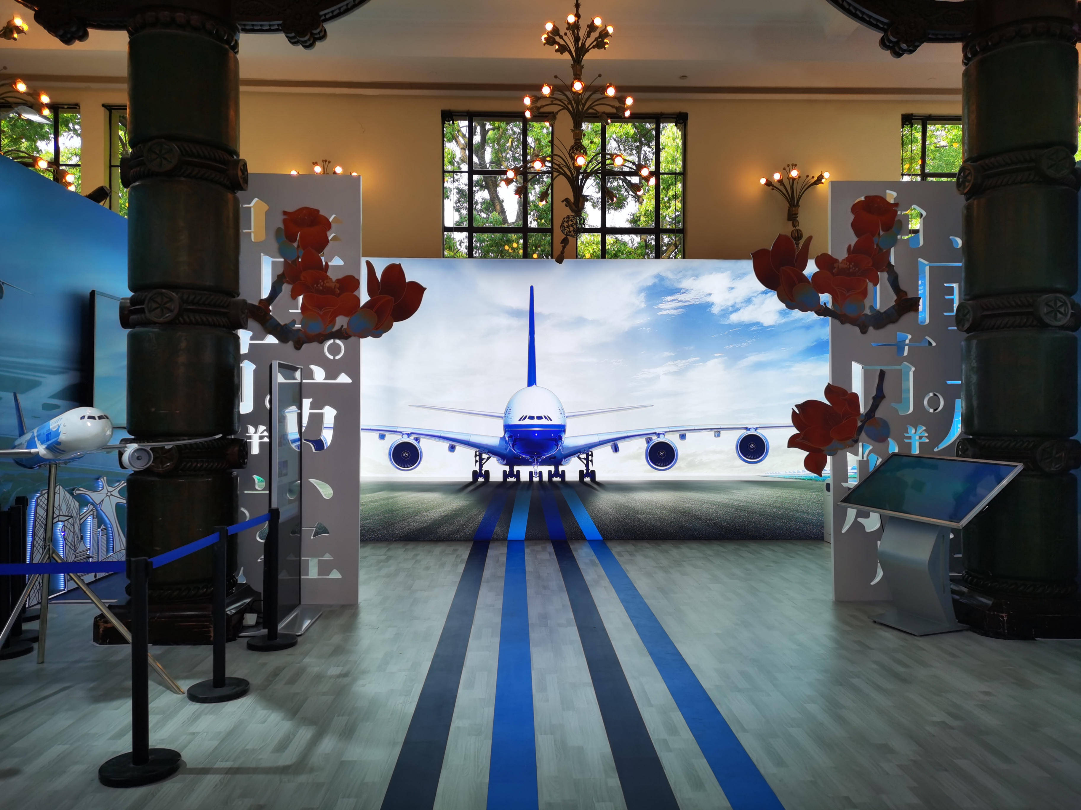 走进南航展台,一架巨大的南航A380客机,沿着地面以安全可靠、双枢纽、科技创新、绿色发展为四大支撑的蓝色跑道,向着观众迎面驶来。南航乘务员杨梓芮向观众介绍道:“南航是中国唯一运营A380超大型客机的航空公司,木棉花是南航的标识。你看飞机正在穿越点缀着火红木棉的华表状立柱,这是象征着南航从新时代的中国‘国门’启航,飞向世界、飞向科技创新和绿色美好的未来,向世界展示中国品牌的风采。”