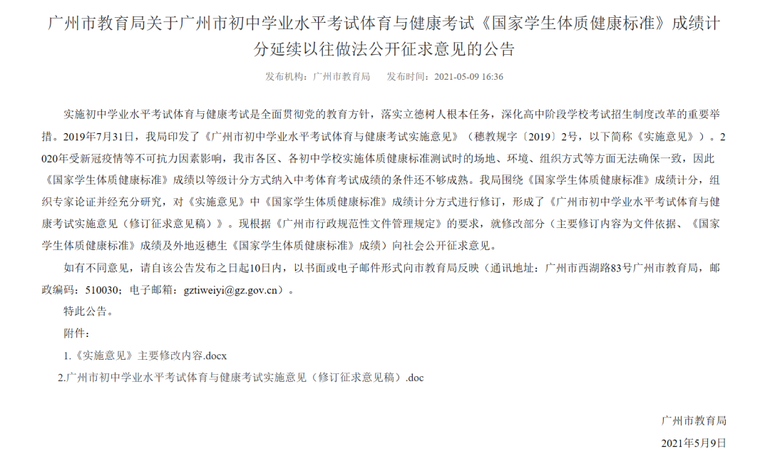 5月9日,广州市教育局官网发布了《广州市教育局关于广州市初中学业水平考试体育与健康考试《国家学生体质健康标准》成绩计分延续以往做法公开征求意见的公告》(以下简称“公告”)。