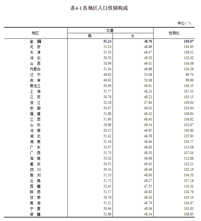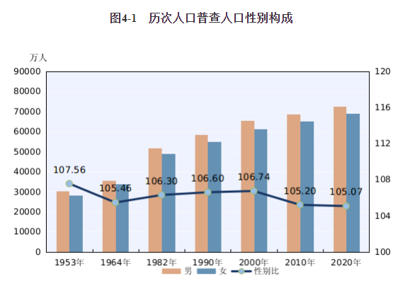 全国人口中,男性人口为723339956人,占51.24%;女性人口为688438768人,占48.76%。总人口性别比(以女性为100,男性对女性的比例)为105.07,与2010年第六次全国人口普查基本持平。