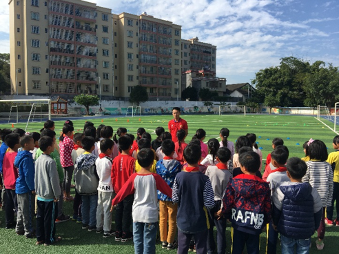 黄埔区新港小学创办于1978年,建校已有40多年。2010年,学校基于学生家庭情况(绝大部分学生是外来务工人员子女)和学校体育科组教师专业优势,利用学校场地和人员优势,将足球作为学校特色。为此,学校每年至少购买足球一千个。如此一来,学生们可以迎着朝霞一进校园就玩,大课间可以玩,课后等待放学回家前也可以玩。