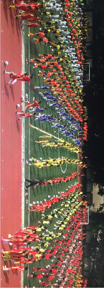 学校除已有体育课程外,针对学生实际水平,进行合理的动作设计,将足球技巧与体操完美融合,编排动感十足的足球操。课间操时间,伴随着动感的旋律,拉球、踩球、颠球、敲球、运球,足球在学生们的脚下变换出各种花样……