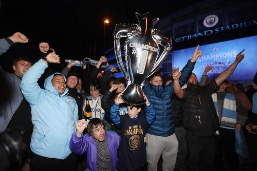 曼城4年来第3次夺得英超冠军,球迷们聚集在伊蒂哈德球场外庆祝,球场外打出巨大的“冠军”图片。