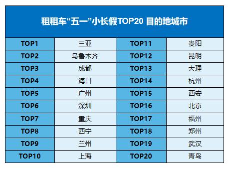 此外,从租车游的热门目的地,也可以看到国内旅游的特色,《报告》显示,三亚、乌鲁木齐、成都、海口、广州、深圳、重庆、西宁、兰州、上海、贵阳、昆明、大理、杭州、西安、北京、福州、郑州、武汉、青岛分别位列今年五一假期热门自驾目的地的前20名。