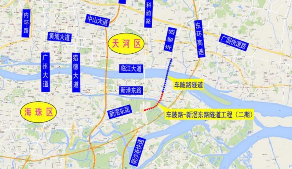 车陂路-新滘东路隧道工程南起新滘东路与科韵路交叉口,北至车陂路与黄埔大道交叉口,全长约4.3公里,分两期进行建设。其一期工程已经开工,二期工程设计线路起点位于新滘东路与科韵路相交路口以西,终点位于新港东路以北,全长约2.5公里,道路整体为西南-东北走向,由南往北依次分为科韵路、海珠湿地保护范围、黄埔涌及新港东路四个节点。