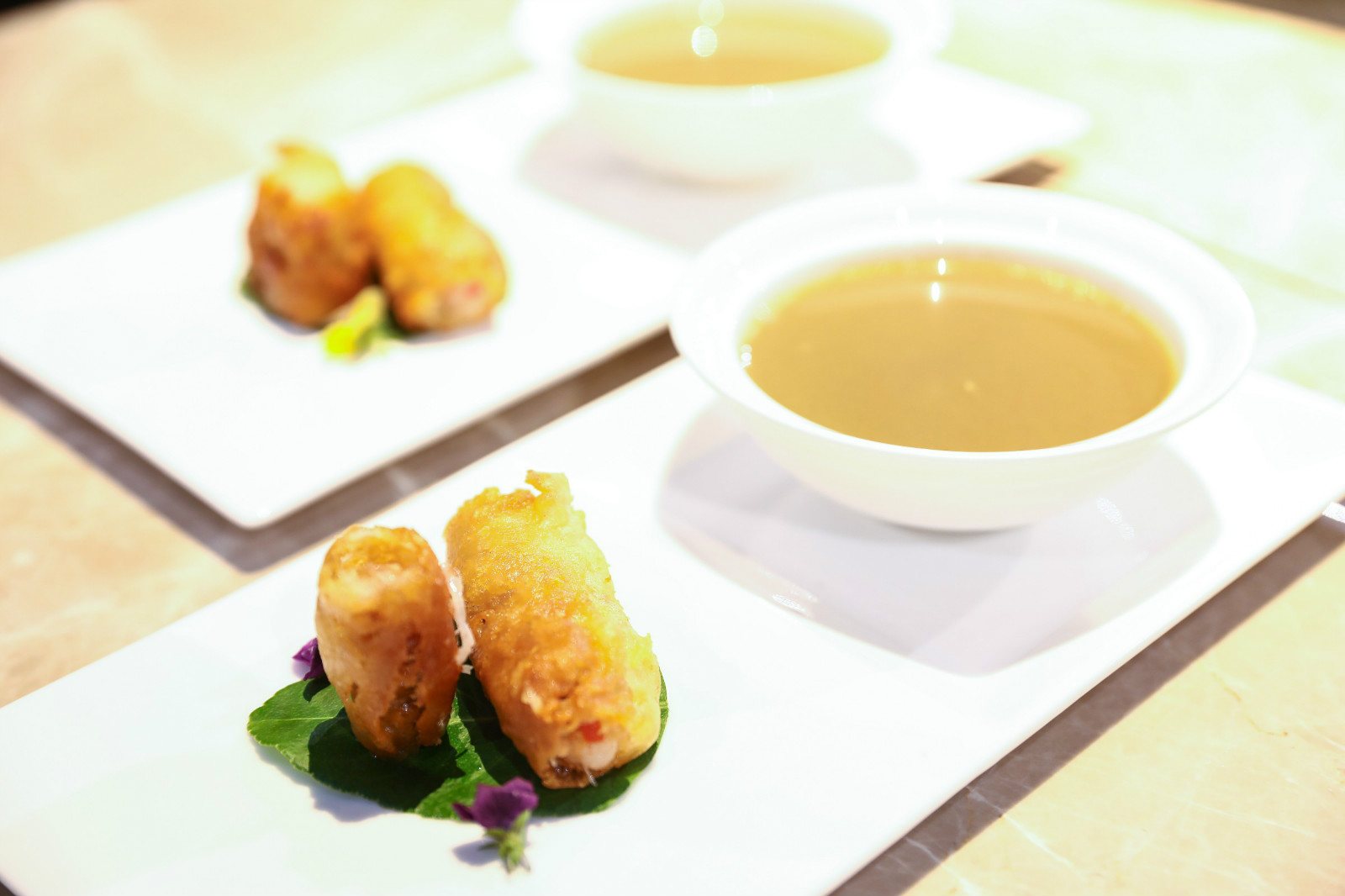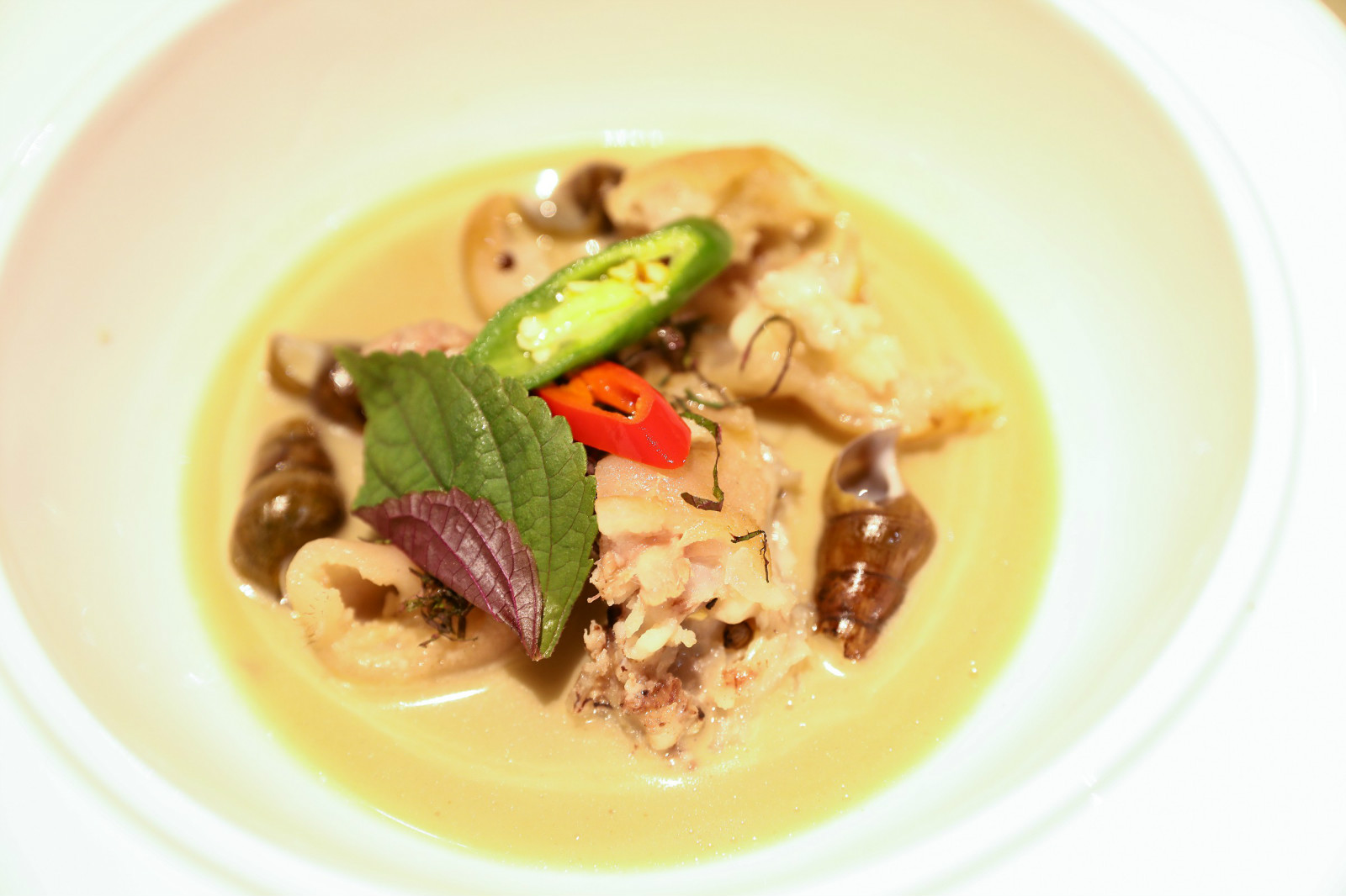 来自东莞的东坑阴菜,有着“东坑人参”的美称,“三剑客队”主厨方云成,别出心裁地将其入汤,搭配口味咸香的石龙豆皮鸡。分子料理手法重出江湖,再以高颜值、高级感菜品征服“美食大咖”。