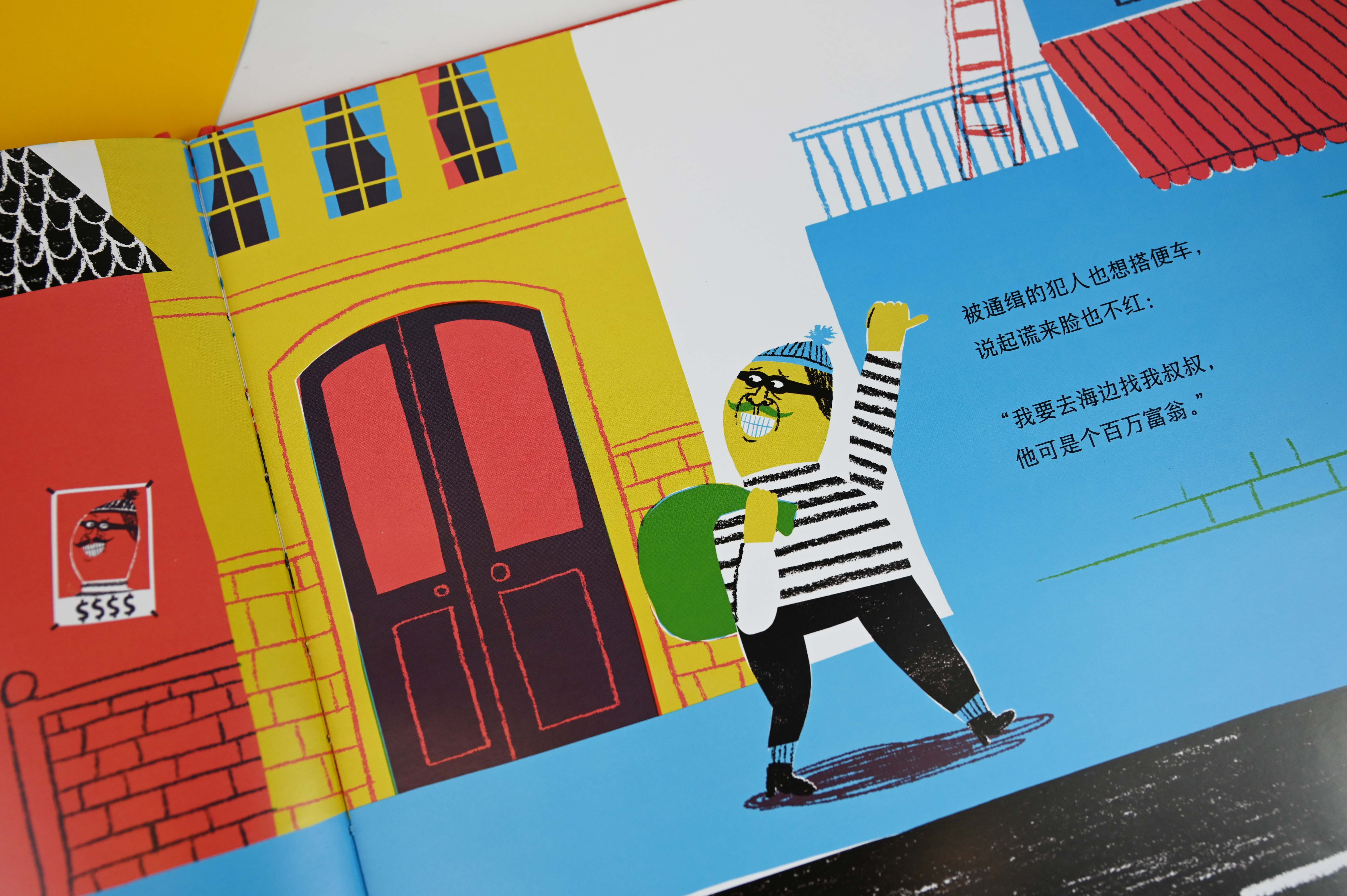 《搭便车》抓住了孩子爱看人出洋相的游戏心理,讲述了一个幽默、荒诞,且十分不完美的搭车故事,节奏明快,易于把握。作者让小读者们熟悉的角色一一登场,彼此关系紧张又好玩,此外,作者还在画里藏了许多细节,比如墙上的通缉令、逐渐变瘪的汽车轮胎……使故事更加丰富,也极大地增强了互动性和趣味性。