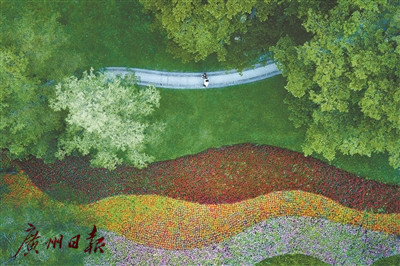 在二沙岛绿道上散步的游人途经波浪状的美丽花景。