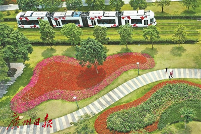 广州阅江中路的碧道旁鲜花盛开,有轨电车从一侧驶过。