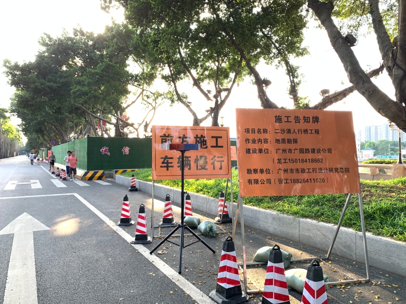 在人行桥施工南岸位置,现场摆放了多块橙色黑字的《施工告知牌》和交通导引指示牌。根据《施工告知牌》,写有“二沙涌人行桥工程”,作业内容为“地质勘探”,建设单位为“广州市广园路建设公司”,勘察单位则为“广州市市政工程设计研究总院”,该院也是二沙岛东部广州首座珠江两岸人行桥的联合设计单位。