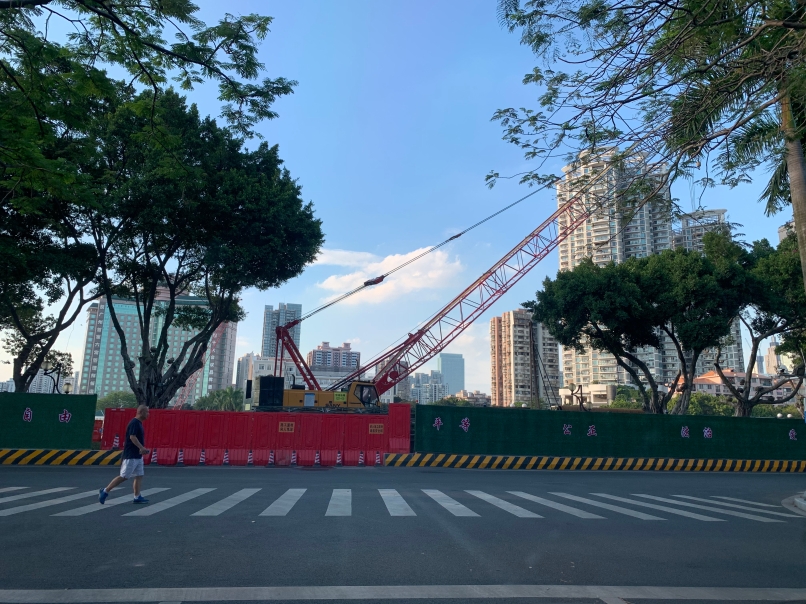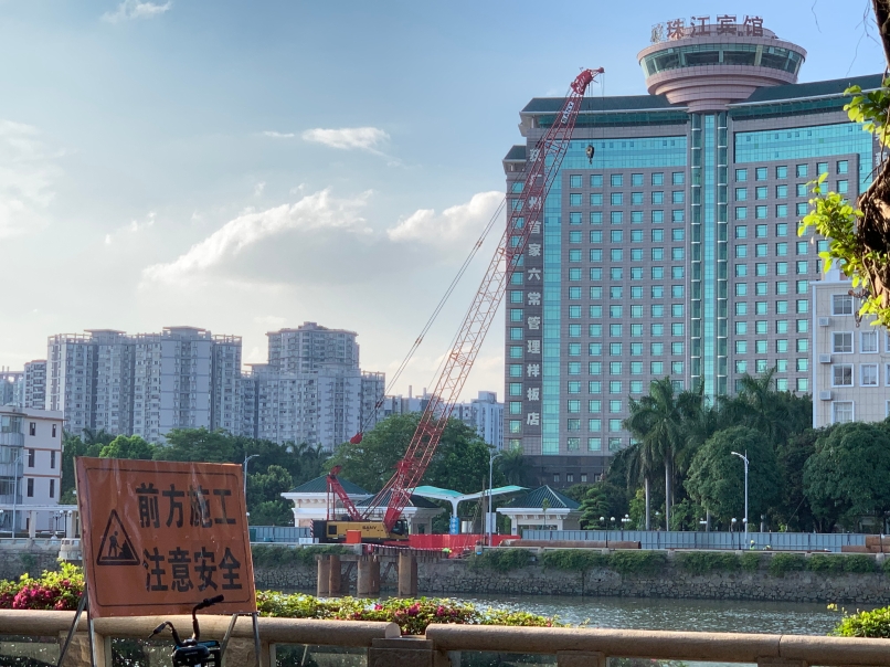二沙涌人行桥南岸位于二沙岛晴澜路和琶洲街交界处,北岸位于江月路珠江宾馆南门对出广场附近位置。广州日报记者昨日看到,南北两岸的施工现场都已经围蔽,两岸都有吊装用途的大型钩机进场,现场也摆放大口径钢管、铁架和其他器材。