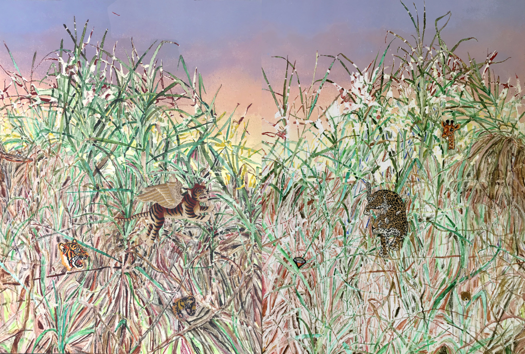 在他最新创作的“舞台”系列,画中的人物或动物迷幻而孤独,敏感而脆弱。他一方面试图从现实图景中汲取灵感和资源,另一方面又有意制造与现实的疏离感,使作品亦真亦幻,吸引观者探索对当下的反思。