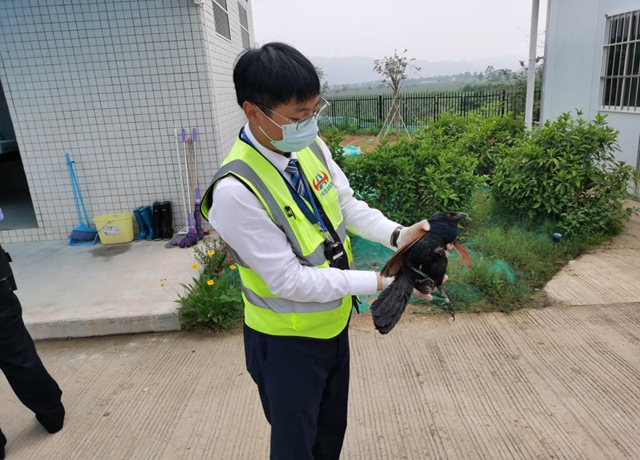 当天,龙山站当值班长蔡家楠在对广场进行巡查时,听到几声沉闷的鸟叫声,他扒开灌木丛发现,一只身长约四十厘米的鸟正趴在草丛中,人走近时也未受惊飞走。“该不是受伤了吧!”蔡家楠心想。出于好奇心,蔡佳楠进一步走上前,将鸟捡起来,发现它的一只脚已经骨折。见此情形,蔡佳楠将它先带回收费站房休息区先行安置,同时将相关情况上报中心收费站。