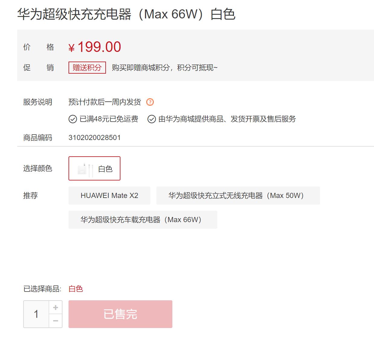 (5月16日,华为官网显示超级快充充电器(Max 66W)显示“已售完”。)