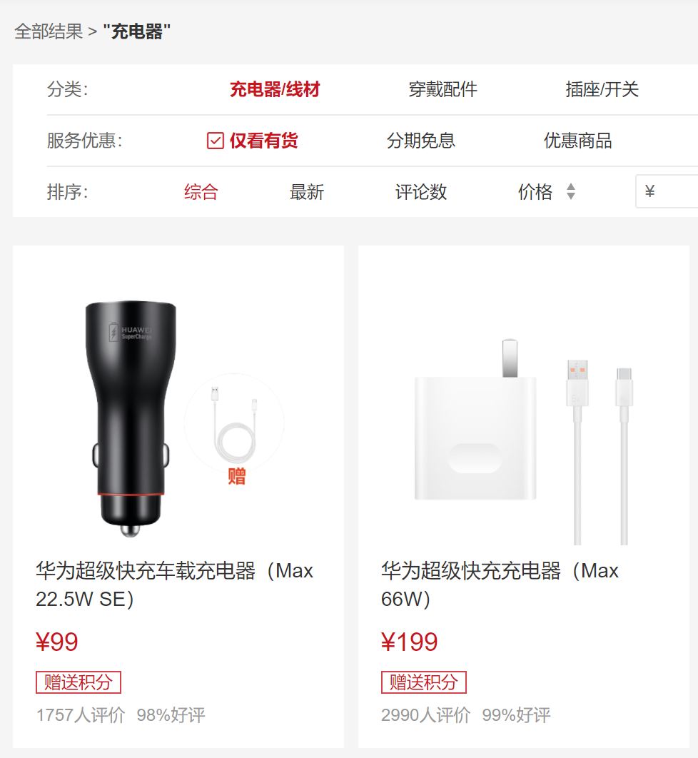 (5月16日,华为官网选中“仅看有货”选项筛选出的华为充电器。)