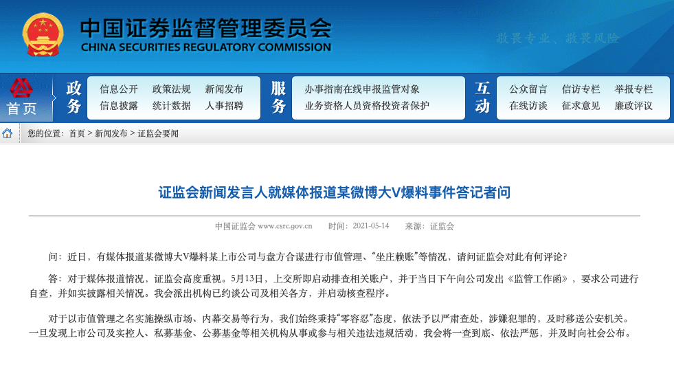 证监会信息显示,近日有媒体报道某微博大V爆料某上市公司与盘方合谋进行市值管理、“坐庄赖账”等情况。对此,证监会高度重视。5月13日,上交所即启动排查相关账户,并于当日下午向公司发出《监管工作函》,要求公司进行自查,并如实披露相关情况。证监会派出机构已约谈公司及相关各方,并启动核查程序。