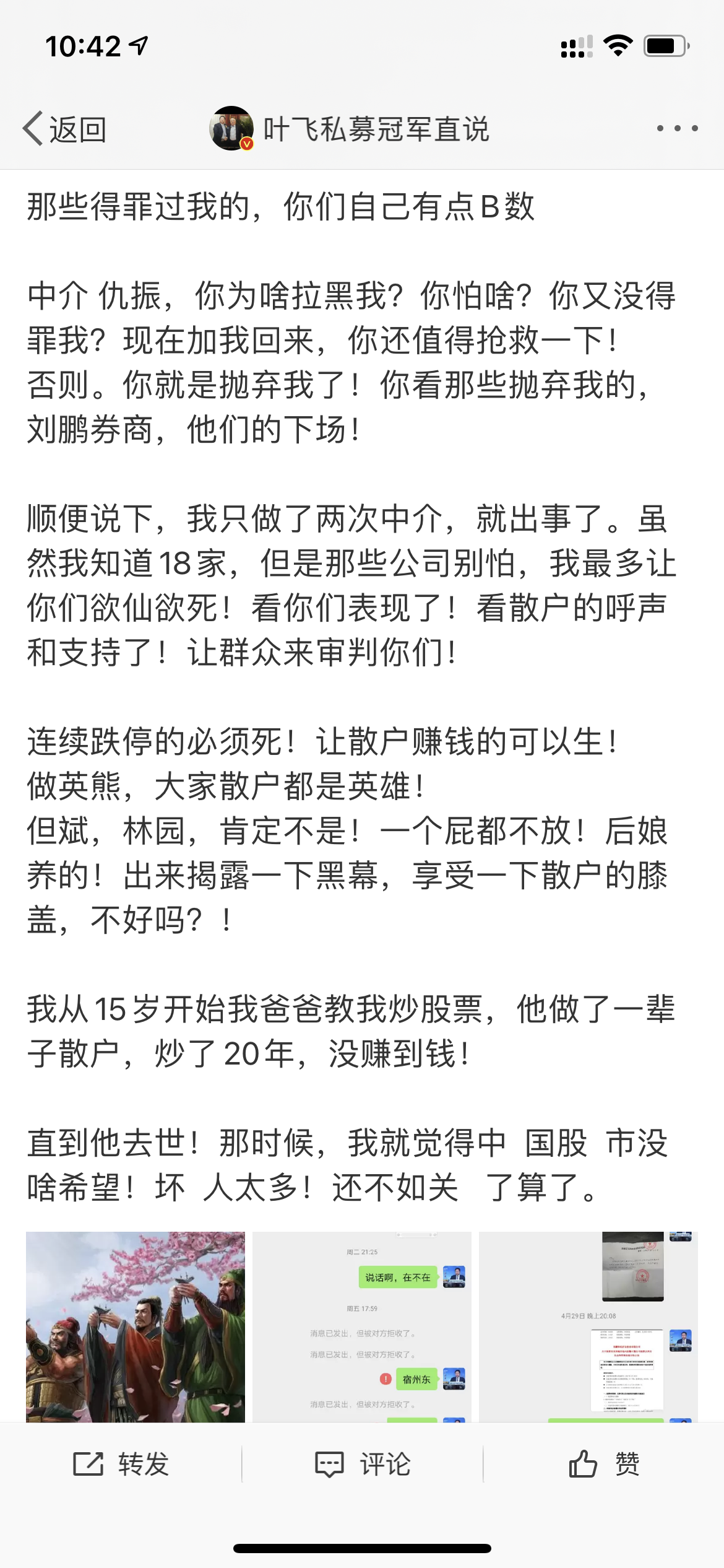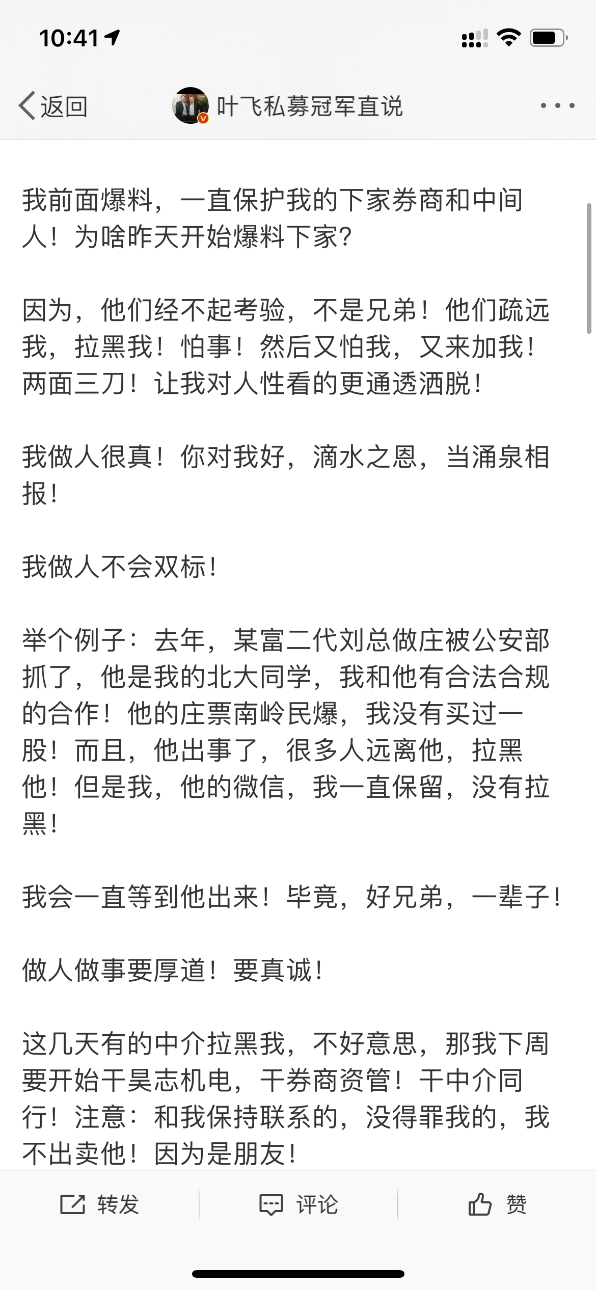 近日,曾经的私募冠军叶飞曝光中源家居操盘方“坐庄还赖账”的黑幕持续发酵,叶飞也不断在微博放料。