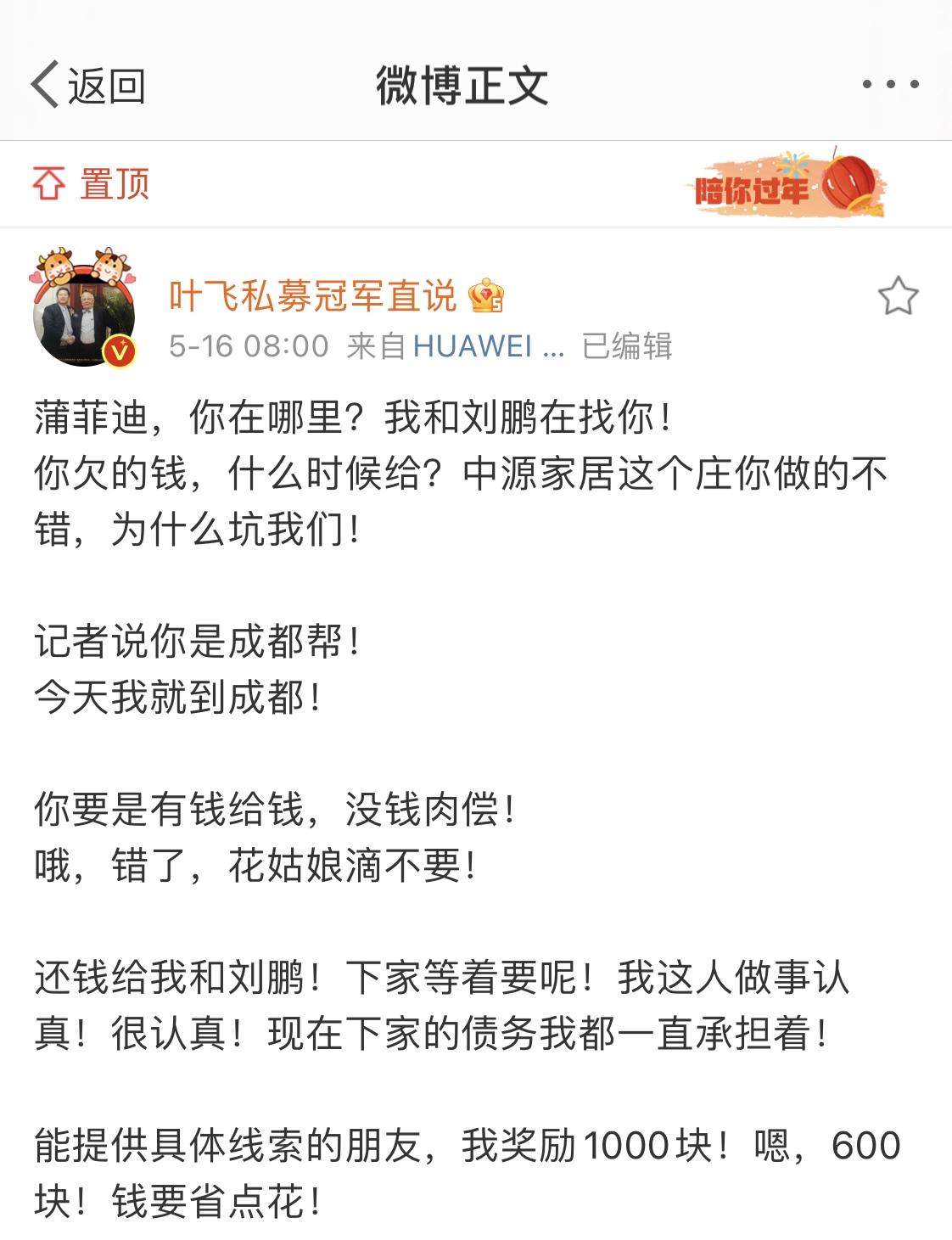 5月13日,叶飞一则微博公开“讨债”内容在投资圈疯转。实际上,该微博内容是5月9日发布的,内容直指上市公司中源家居(603709.SH)市值管理找的操盘方。
