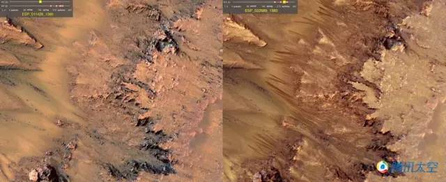 这是美国宇航局火星勘探轨道飞行器(MRO)2011年在轨道上拍摄的火星同一区域的变化,照片显示坑壁上流动的液体痕迹在从晚春到早秋的这段时间里,变得更长且颜色变暗了。这些都是火星表面温暖季节出现液态水流动的证据。(图源:腾讯太空)