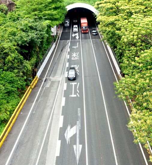 同时,改造后将入隧道前的限速牌由100km/h降至80km/h,配套增加了提示标牌8块,修改标线318m²,隧道内增加3块电子可变情报板刊播安全提醒标语,为车辆各行其道提供了更加清晰的指引。