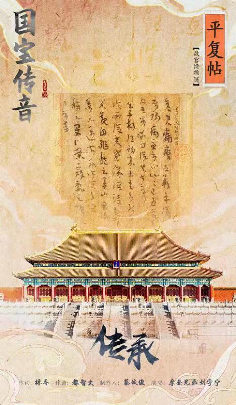 此次推出的五首文物推广曲是为五大知名博物馆分别量身打造的《传承》《琢光曲》《铸梦》《思华年》和《时光颂》。由摩登兄弟刘宇宁演唱的歌曲《传承》讲述了故宫博物院藏品《平复帖》的故事。晋代文学家、书法家陆机,得知友人身体抱恙、难以痊愈的消息后,情真意切地写下信札,成为了流传后世的“中华第一帖”。“历史的重重叠叠,笔画的盘丝屈铁。连转草隶,千丝万缕的情抒引牵”——在歌手的演绎下,这份1700余年前的质朴情谊仿佛穿越了时空。