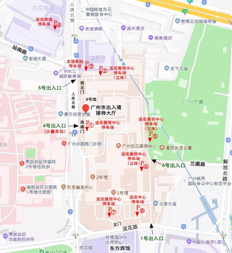 P⑦、P⑧越秀区流花路115号流花展贸中心正门(东方宾馆对面)。