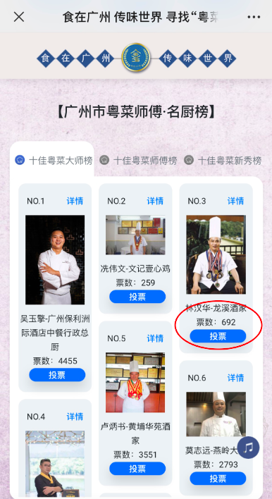 即日起5月25日,大家可扫描下方二维码,进入投票页面,下拉至【广州市粤菜师傅·名厨榜】,选择【十佳粤菜大师榜】,选择【林汉华-龙溪酒家】进行投票哦!(每个微信号每天能投3票)