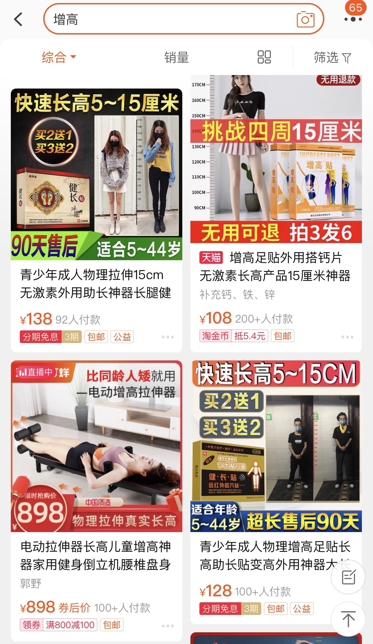 在电商平台上,商家俨然已然嗅到商机,纷纷推出钙锌咀嚼片、助力增高贴、增高拉伸机等五花八门的“增高神器”,宣称可以“激活骨骼二次发育”,实现“快速长高5到20厘米”,适用年龄上限甚至达到44岁。然而,专家指出其中存在不少认知误区,建议大家理性看待,选择科学增高。