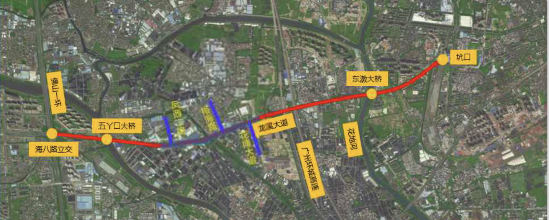 裕海路与龙溪大道丁字交叉,现状裕海路位于龙溪大道北侧,两侧分别为美国埃索加油站和芳村交通汽车维修服务中心,裕海路为龙溪凤池村居民的主要进出通道,现状裕海路与龙溪大道相加采用灯控和行人斑马线过街。裕海路南侧为龙溪大道加油站位置,与裕海路北侧未打通。为打通裕海路延伸至南侧,需新建裕海路跨线桥,使龙溪大道辅 道与裕海路平面十字交叉,主线上跨裕海路,裕海路南北联通直行。裕海路跨线桥桥 长约 280米,桥宽 2x13米。