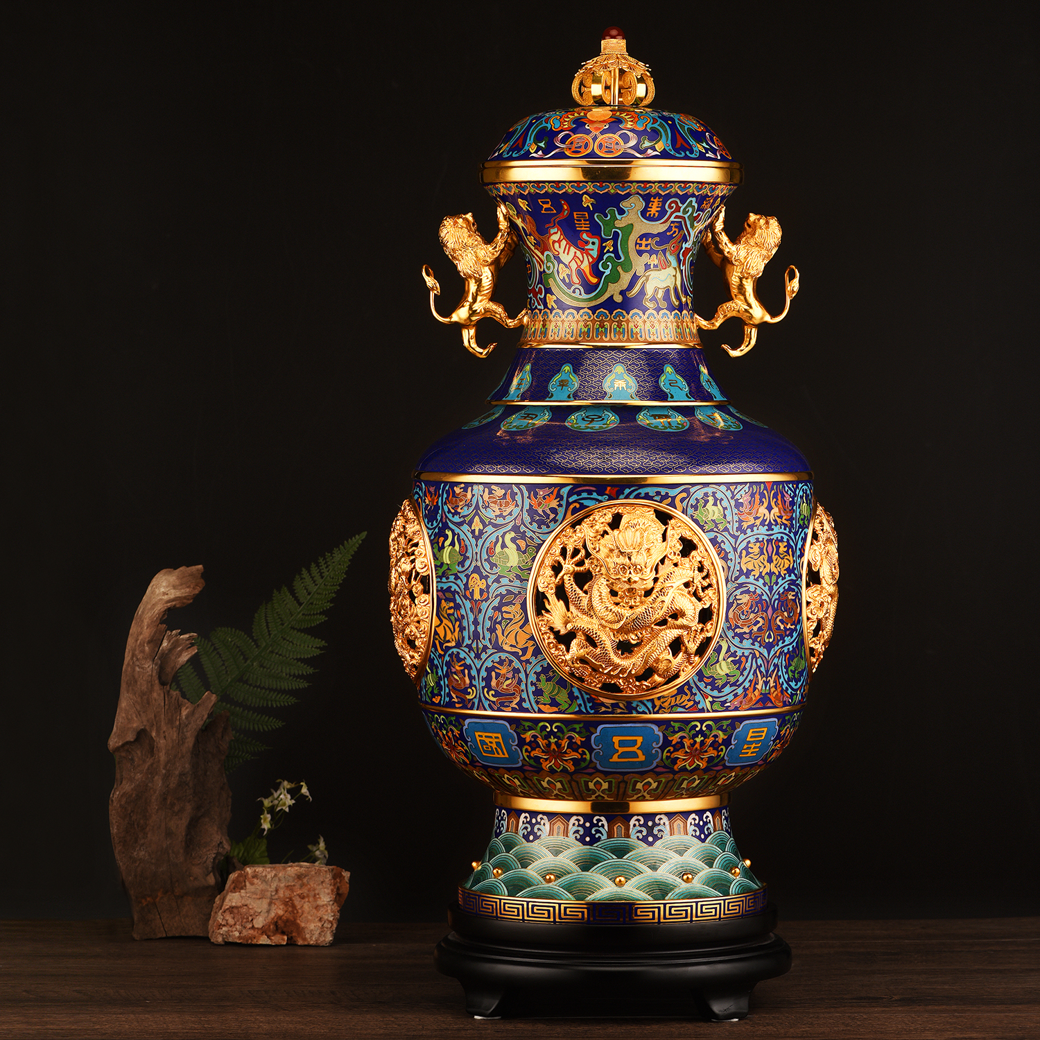 景泰蓝工艺的艺术特点可用形、纹、色、光四字来概括。一件精美的景泰蓝器皿,首先要有良好的造型,这取决于制胎;还要有优美的装饰花纹,这决定于掐丝;华丽的色彩决定于蓝料的配制;辉煌的光泽完成于打磨和镀金。所以,它是集美术、工艺、雕刻、镶嵌、玻璃熔炼、冶金等专业技术为一体,是传统中国宫廷艺术的典型代表。