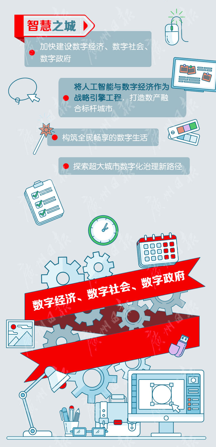 统筹推进数字经济、数字社会、数字政府一体化发展,建设智慧之城,将广州打造成为国际一流智慧城市。