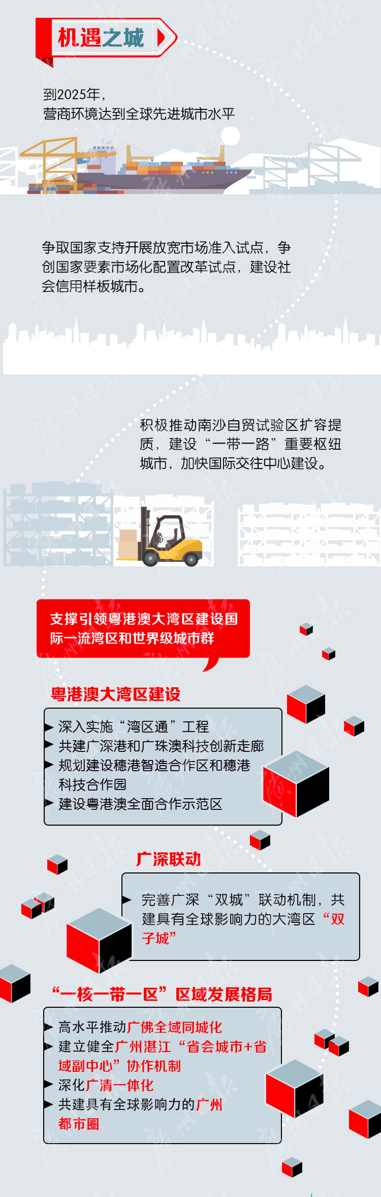 统筹推进“双区”建设、“双城”联动和现代化国际化营商环境优化,建设机遇之城,将广州打造成为全球企业投资、国际人才汇聚首选地和最佳发展地。