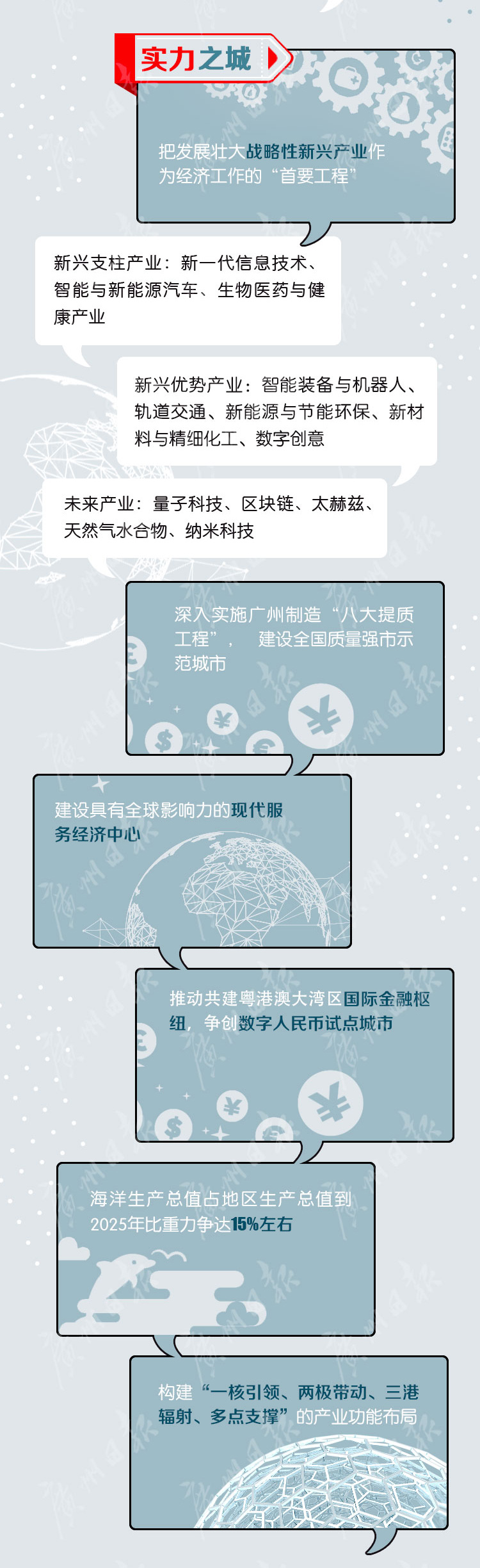 统筹推进现代产业体系构建、产业发展布局优化,建设实力之城,将广州打造成为新发展阶段高质量发展典范。