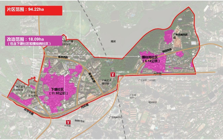 本次片区策划范围位于越秀区登峰街道南部,北邻麓湖,西至广州市电子信息学校,东部至广州市胸科医院,南至内环路,片区策划范围约94.22公顷。实施方案范围分为下塘片区与横枝岗片区,其中下塘片区北临麓景西路,西至下塘西路,东至麓景路,南至内环路;横枝岗片区北临麓湖,西至横枝岗路,东至广州市胸科医院,南至内环路。实施方案范围为18.09公顷,其中下塘片区11.95公顷,横枝岗片区6.14公顷。
