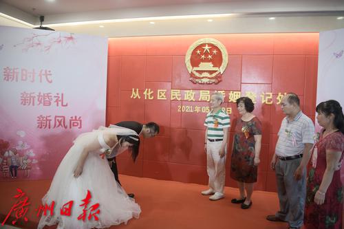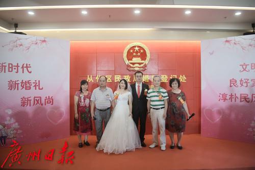 新人和双方父母留影。“家庭文明则社会文明,首场新时代文明婚礼,积极倡导“喜事新办”树新风。”从化区新时代文明实践中心负责人认为,婚礼的“新”体现在三个方面,一是仪式感强,十个新环节提升了婚礼仪式感;二是文明味浓,邀请“文明家庭代表”分享经验,“中国好人”证婚,发布文明婚礼倡议;三是新人获得感强,推出了“百年好合”“花好月圆”“情比金坚”三个新时代文明婚礼套餐,让新人们省心省费用。