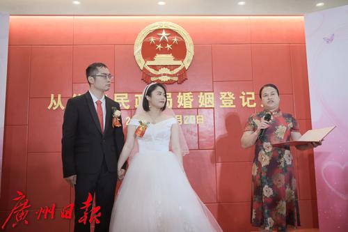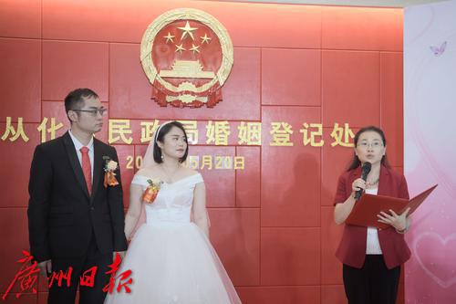 “你若不离,我便不弃。今天,我们在此结为夫妻,感谢你成为我的挚爱,未来的日子里,共同分享彼此的梦想、渴望和幸福。”在5月20日这个特别的日子里,一场别开生面的婚礼在广州市从化区婚姻登记中心举行。这是广东首场新时代文明婚礼。