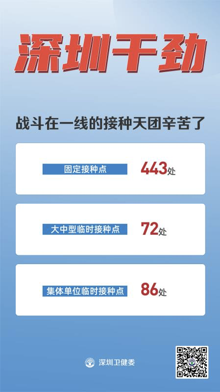 据市卫健委统计,深圳设置新冠疫苗固定接种点443处,大中型临时接种点72处,集体单位临时接种点86处,日接种能力达41.8万剂次。