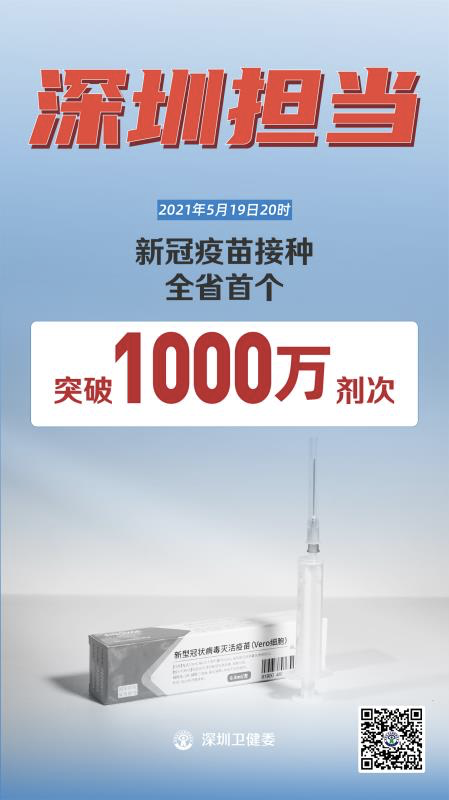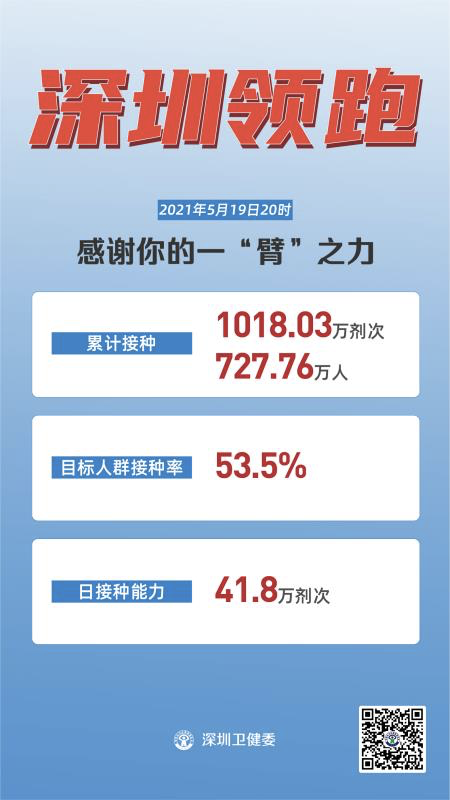 你接种新冠疫苗了吗?感谢你的一“臂”之力!截至5月19日20时,深圳成为全省首个新冠疫苗接种突破1000万剂次的城市,累计接种1018.03万剂次,累计接种人数为727.76万人,目标人群接种率达53.5%。