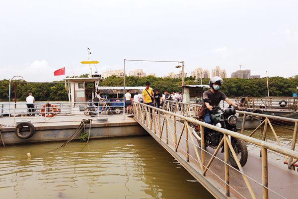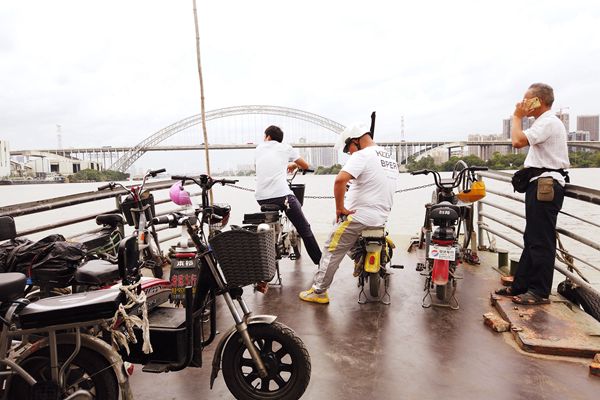 下午4点,记者在码头看到,已有三五成群的村民骑着电动车在大榕树下等候。等渡船慢慢停下时,老板郭伟明熟练地放下艞板,把缆绳拴在船柱上。船上的人依次走出,岸边的人又鱼贯而入,郭伟明每天看着这样的景象,来来回回不少于30趟。“我承包这个渡口已经有30多年了,开船的船夫比我还久,他在这里干了40年。除了刮台风,我们每天都在船上度过一大半的时间。”郭伟明告诉记者,以前每天乘坐渡船的村民有三四千人,近些年逐渐减少,尤其是石溪村附近工厂搬迁后,每天的乘客缩减至八九百人。“大部分都是住在南浦的村民,他们有的是在海珠工作的上班族,有的是本地村民拿自己种的菜乘船去市区卖,更多的是附近加工厂的工人去中大布匹市场拿货。”