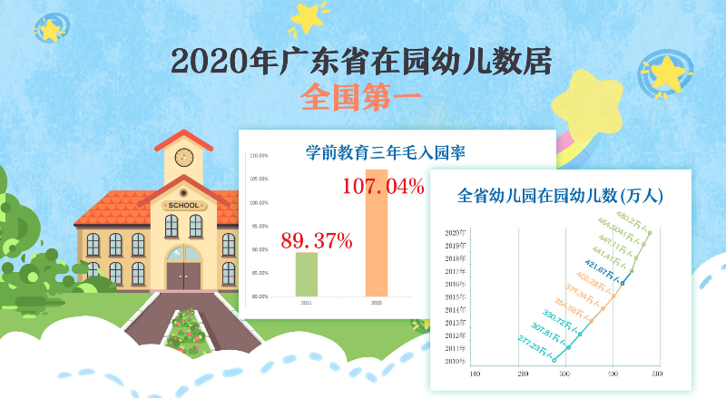 自2011年以来,广东启动了三期“广东省发展学前教育行动计划”,2020年和2021年连续两年将幼儿园普惠性学位建设列入省十件民生实事之首,积极构建广覆盖、保基本、有质量的学前教育公共服务体系。从广东省学前教育十年发展“大数据”中,可以追寻到学前教育发展“腾飞”的轨迹。