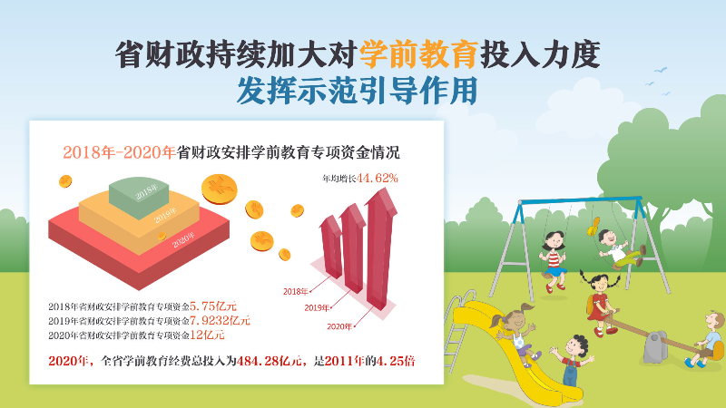 全省学前教育经费保障能力明显增长。2020年,全省学前教育经费总投入为484.28亿元,是2011年的4.25倍,明显高于在园幼儿数增幅。在各级各类教育中,学前教育经费增幅最快。省财政持续加大对学前教育投入力度,发挥示范引导作用。2018-2020年省财政安排学前教育专项奖补经费分别为5.75亿元、7.9232亿元和12亿元。