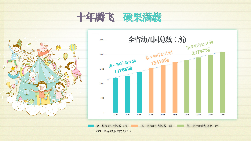 据悉,2011年全省启动第一期发展学前教育三年行动计划之初,全省幼儿园数仅为11785所,2014年启动第二期行动计划时达到15416所,2017年启动第三期行动计划时达到18048所,至2020年底第三期行动计划结束时达到20747所,十年期间幼儿园数年均增长7.6%。