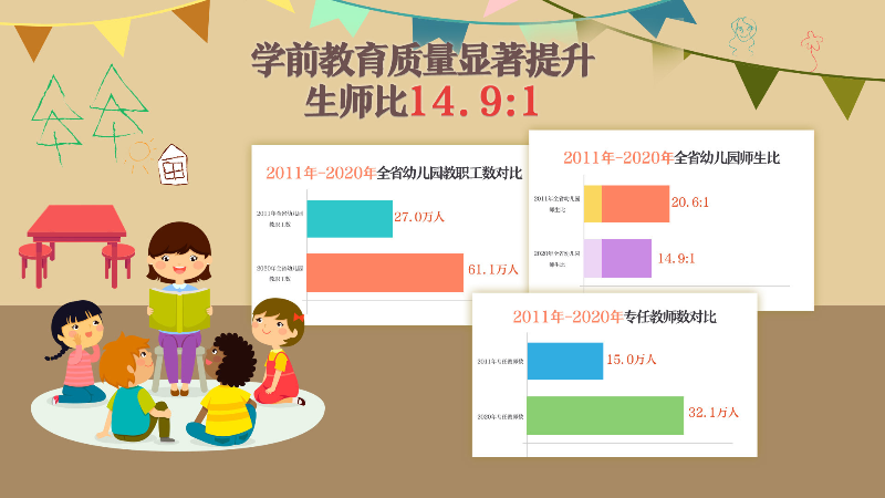 数据显示,全省幼儿园教职工数从2011年的27.0万人,增长到2020年底的61.1万人;专任教师从15.0万人增长到2020年底的32.1万人,十年间教职工数和专任教师数增长了一倍,生师比从20.6:1缩小到14.9:1。