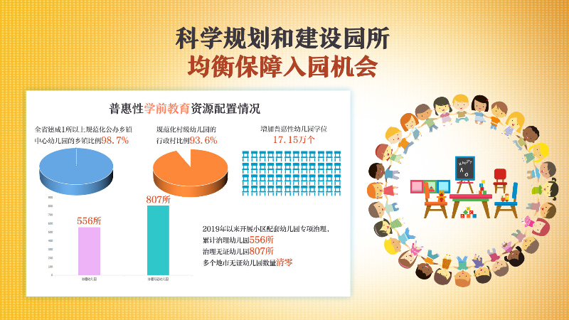 加强公办乡镇(街道)中心园和村级园建设,全省建成1所以上规范化公办乡镇中心幼儿园的乡镇比例达98.7%,建成规范化村级幼儿园的行政村比例达93.6%。2019年以来开展小区配套幼儿园专项治理,累计治理幼儿园556所,增加普惠性幼儿园学位17.15万个。治理无证幼儿园807所,多个地市无证幼儿园数量清零。