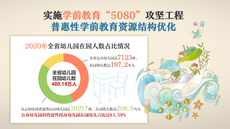 全省公办幼儿园达7123所,在园幼儿数达197.2万人,认定和扶持普惠性民办幼儿园达10217所,普惠性民办幼儿园在园幼儿达208.9万人,公办幼儿园和普惠性民办幼儿园在园幼儿占比达84.59%。越来越多家庭子女选择进入普惠、安全、规范、优质、接送便利的幼儿园。