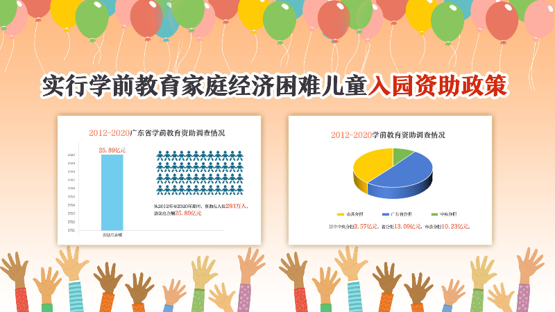 2015年教育、财政等多部门联合印发实施《广东省普惠性民办幼儿园认定、扶持和管理办法》,2018年全省建立学前教育生均拨款制度,2020年开始连续两年将增加公办学位供给列入省十件民生实事。