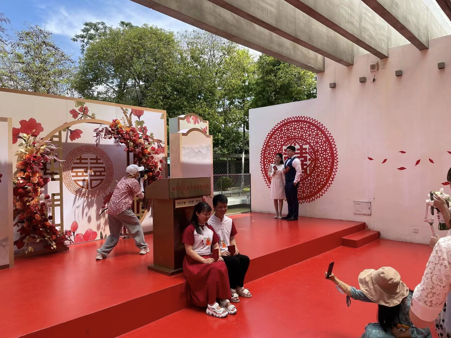上午10点,20对新人佩戴腕花,携手进入颁证厅,行执手礼、合卺礼,一起盟誓,相互交换定情信物。“集体颁证仪式,是我们发布消息,新人自愿报名参与的,希望通过一个简约适度的颁证仪式,让新人们了解到婚姻的责任和义务。”